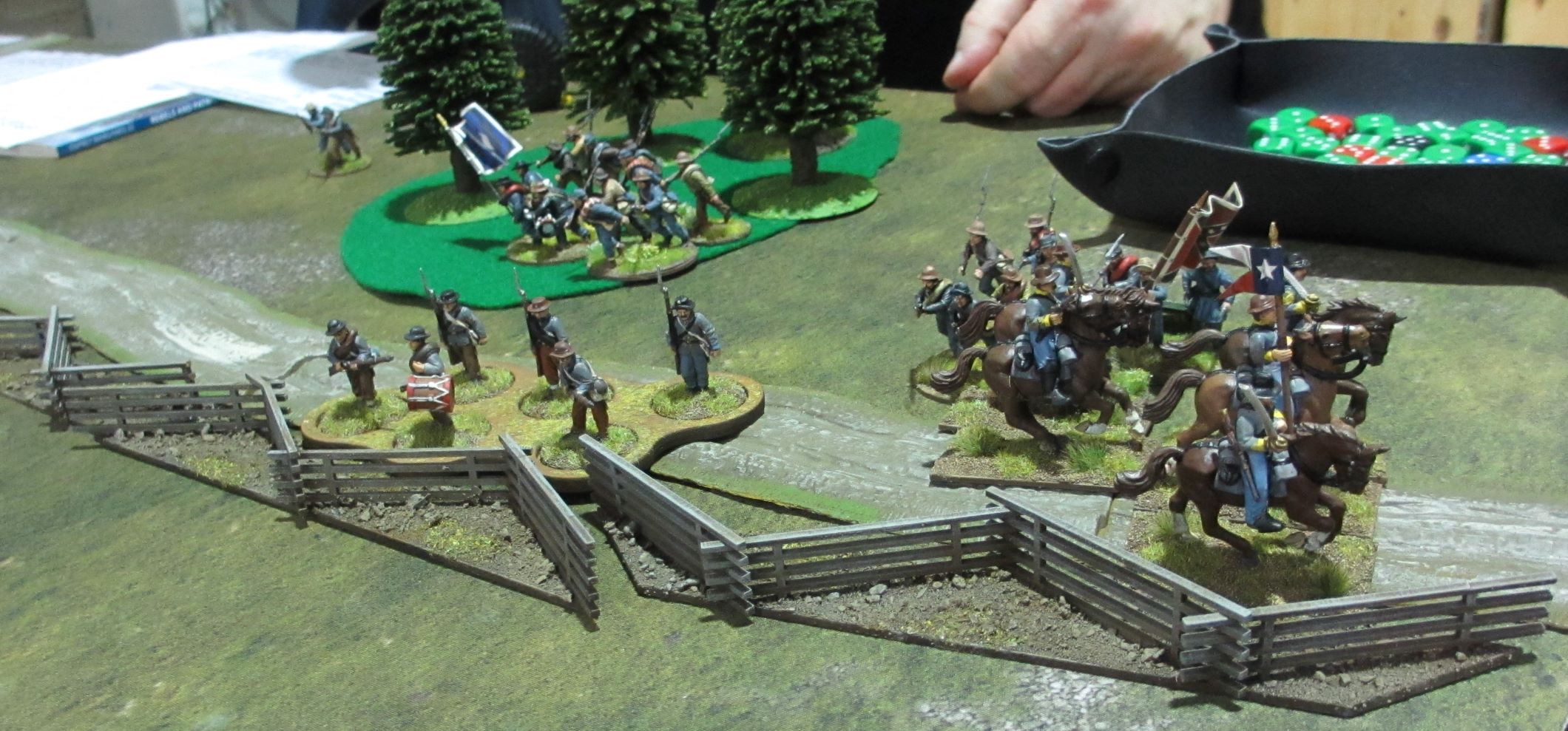 Rules were Rebels and Patriots and the scenario was devised by Neil (who also provided the bulk of the Confederates). The Union were in possession of the hill and the rebels controlled the crossroads. Victory was to the player who controlled both by games end.