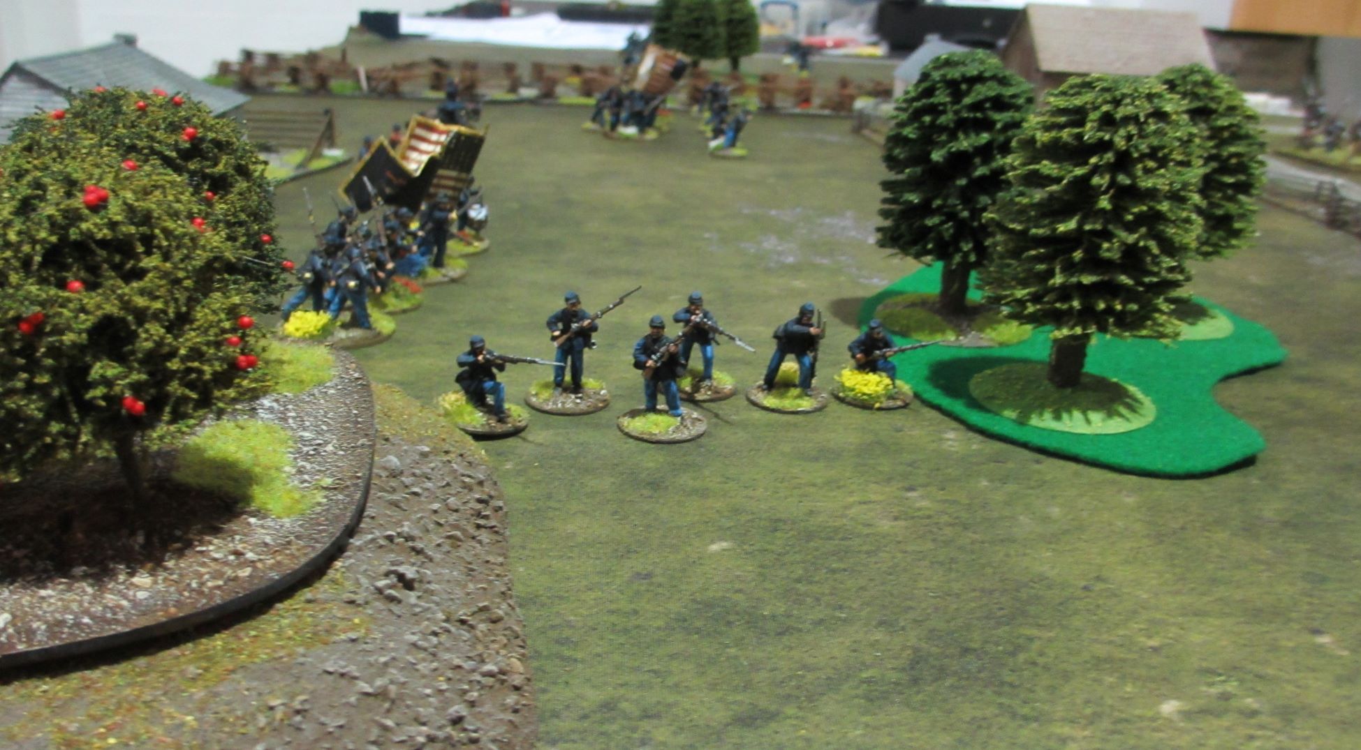 Club night last night and my first opportunity to try out my Union troops and (some of) my Confederates. I was a few minutes late and so was not able to deploy all my snake fencing as a lot had already been laid out but also I got to use The Little House On The Prairie plus my new apple orchard.